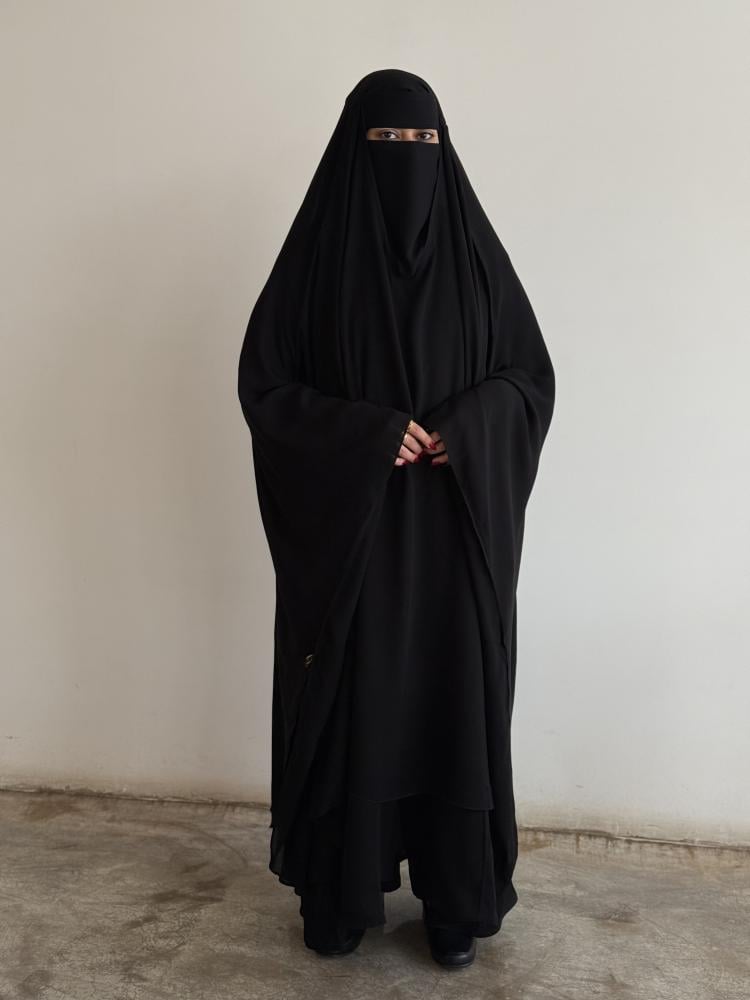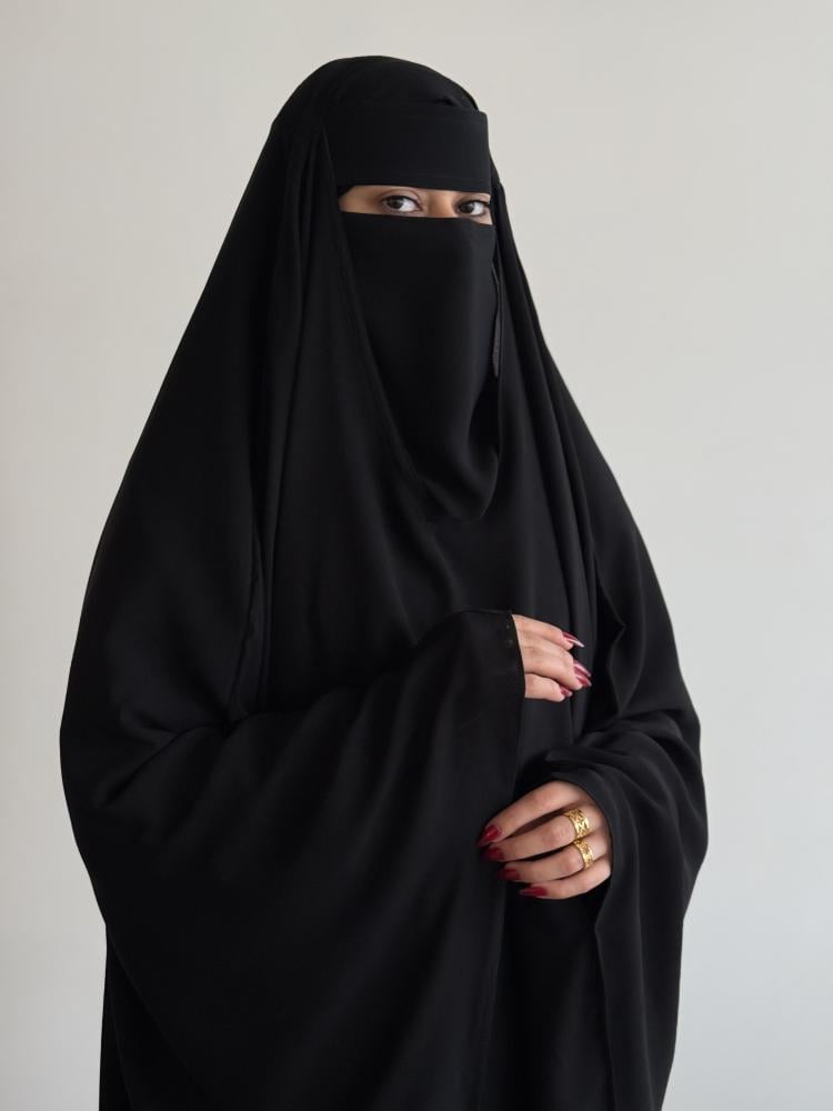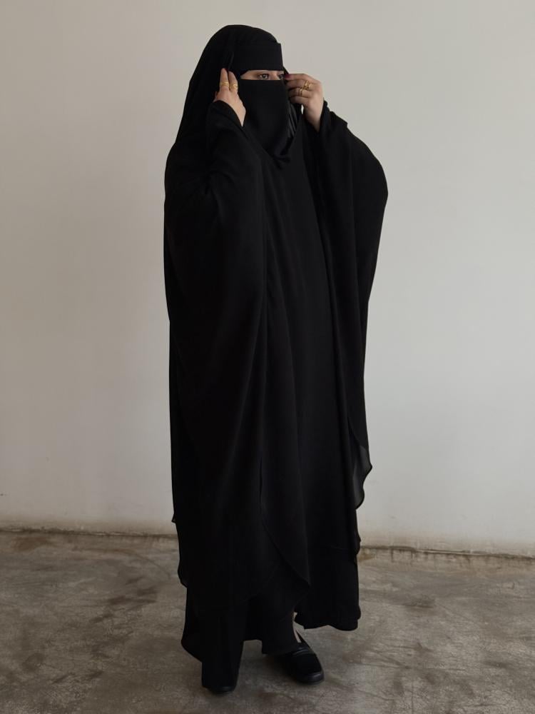 خمار شيلة بمطاط ساتر وعملي يمنحك إطلالة أنيقة ومحتشمة، بديل لعباية الراس يُلبس على عباية كتف.